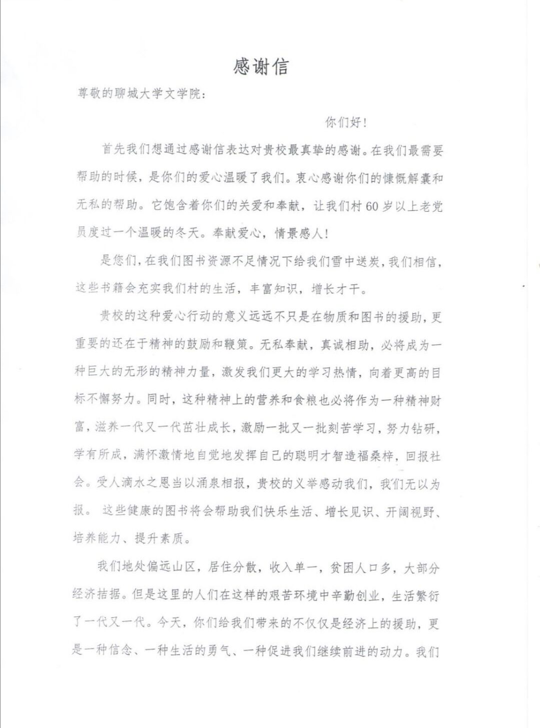 近日,太阳成tyc9728集团国学经典“邮递员”团队收到云南省怒江州兰坪县人民的感恩信,该信特别感谢太阳集团网tyc9728“携手边疆送暖意,邮递真情入云滇”捐赠衣物书籍等一系列爱心援助,感谢太阳集团网tyc9728这一爱心行动的背后更为当地人民提供精神慰藉。