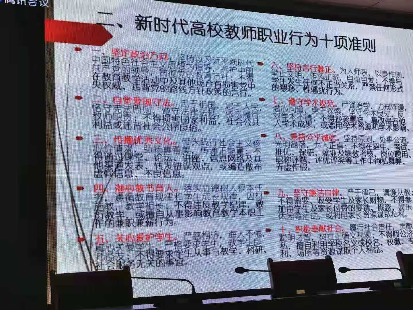 本次师德专题讲座对我院教师深入理解高校教师职业行为准则的内涵起到了积极的促进作用,让教师们感受到教育的情怀、教育的力量和教育的温度,为进一步加强学院师德师风建设指明方向。