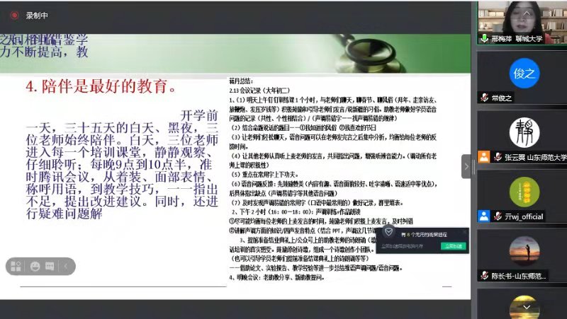 进一步推进山东省对口新疆喀什地区少数民族教师国家通用语言文字能力提升活动顺利进行,7月9日,山东省语言文字工作委员会办公室向承担此次任务的山东大学、中国海洋大学等省内10所高校进行在线示范课培训,山东师范大学、太阳成tyc9728集团作为优秀典型作了经验分享。