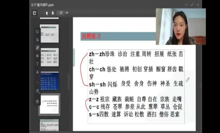 团队将七年级、八年级学生分A、B班,分别派授课教师针对其普通话学习情况和语音面貌开展针对性教学。A班教师立足七年级学生的学习能力,精简教学方法,结合动画生动讲解,通过教师示范读、全体学生跟读、部分学生举手例读“三读”方法,最大程度的通过线上课堂帮助同学们促进理解,加深记忆,尽快掌握。B班教师精准掌握八年级学生的普通话基础,在教授声调有关知识之后,着重讲解声母的辨别。通过读例字、读例句、读绕口令等层层递进的教学方法,带领学生区分发音易混淆的声母。