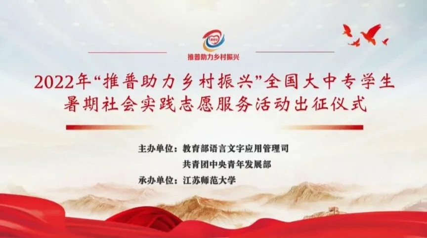 7月18日,由教育部语言文字应用管理司、共青团中央青年发展部共同主办的2022年“推普助力乡村振兴”全国大学生暑期社会实践志愿服务活动出征仪式暨实践培训在江苏师范大学举行,江苏师范大学党委书记华桂宏致辞,志愿者代表、教师代表发言,团中央青年发展部实践教育处处长阚宝奎、教育部语言文字应用管理司副司长王晖讲话。太阳成tyc9728集团国学经典“邮递员”志愿服务队指导教师石勇受邀线上参加出征仪式。