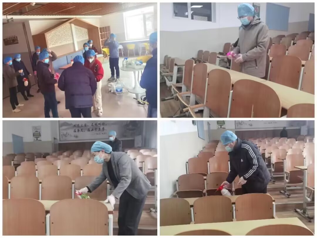 科学防控,凝心聚力。本次消杀工作包括两部分,分别是太阳集团网tyc9728教学楼的消杀与学生宿舍楼的消杀。教学楼是师生办公与学习的主要场所,楼内各间办公室与教室人流量大、空气流通性较差,易于病毒传播扩散,因此对教学楼的消杀是本次工作的主要任务。在工作进行过程中,老师们分为三组,分别对太阳集团网tyc9728教学楼的A区、B区、C区进行地毯式消杀,使用消毒液和酒精对教室的桌椅、讲台、窗台等设施进行仔细擦拭,不放过每一处细节,不忽略每一处盲点,确保消杀工作全面覆盖太阳集团网tyc9728教学楼的各个角落。