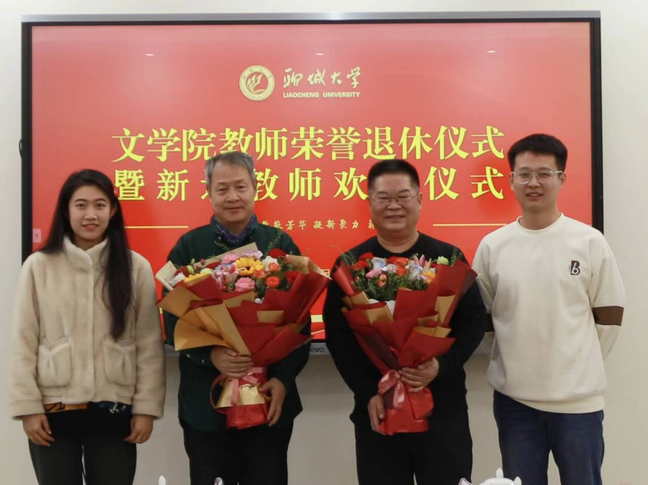 首先,李承虎向三位荣休教师送上真挚的祝福,赞扬他们兢兢业业、任劳任怨的优良品质,同时希望新进教师不忘初心,秉承聊大精神、学院院训,不断推动学院高质量发展。闫振宁为荣休教师颁发证书,希望荣休教师们能继续关注与支持学院发展,为学院发展献计献策。冀相奎介绍三位荣休教师的工作经历及工作业绩,充分肯定他们为学院学校作出的重要贡献,并对新进教师表达期许:希望新进教师们能够成为有理想信念、有道德情操、有扎实学识、有仁爱之心的“四有”好老师。肖佃军以赠送纪念品的方式传递“莫道桑榆晚,为霞尚满天”的浓浓真情。新进教师们用一束束鲜花表达了对荣休教师的尊敬、祝福之情,荣休教师向新进教师代表赠送传承纪念品,希望他们可以接过教书育人的接力棒,用实际行动践行一名教师的初心使命。随后,两位荣休教师依次发表感言,陈黎明用朴素的语言回顾了自己的工作经历,言谈间饱含自己对教育事业的忠诚和热爱,深蕴自己对学院发展的美好祝愿。刘广涛表示自己在学院找到了归属感与幸福感,希望新进教师可以将中国文化当成一份责任、一份热爱传承下去。徐一凡、杨来来作为新进教师代表发言,表示在未来的工作中将继续努力,沿着前辈的足迹勇于担当、扬帆起航。教师代表董秀梅向三位荣休教师表示崇高敬意,致以美好祝福,向新教师表示热烈欢迎,希望他们以人为本,培养栋梁之才。教师代表宁登国回忆起与三位荣休教师工作过程中的点滴,表达与荣休教师们的深厚感情,祝愿三位荣休教师退休以后,活出人生的豁达、人生的洒脱,活出人生的第二个春天。教师代表张雪飞对勤勤恳恳从事教育工作几十载,把美好年华奉献给教育事业的三位荣休教师表达衷心感谢。最后,伴随着一曲《不忘初心》,参会教师们合影留念。