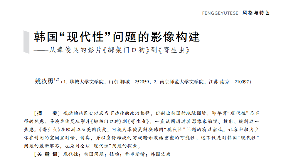 近日,我院姚汝勇老师的论文《韩国“现代性”问题的影响建构——从奉俊昊的影片<绑架门口狗>到<寄生虫>》刊发于《电影文学》2022年第3期。