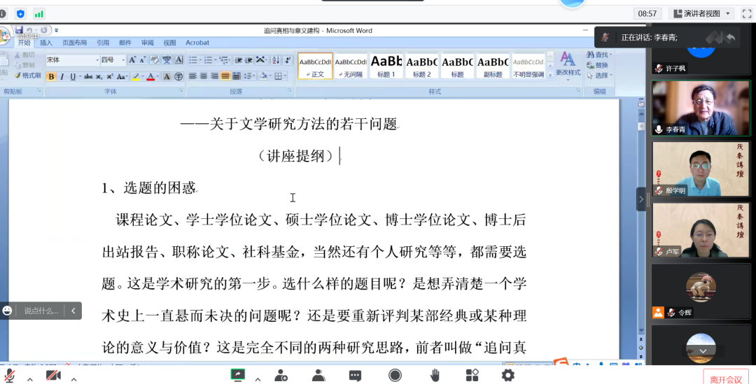 会议伊始,卢军对李春青教授及会议内容进行简要介绍。随后,李春青以“追问问题”和“意义建构”两种不同的研究思路为主线,从选题的困惑、评价的困惑、经今文学与经古文学、汉学与宋学、“尊德行”与“道问学”、“说明”与“理解”、科学主义与人文精神等角度分析了文学研究的方法和视角。