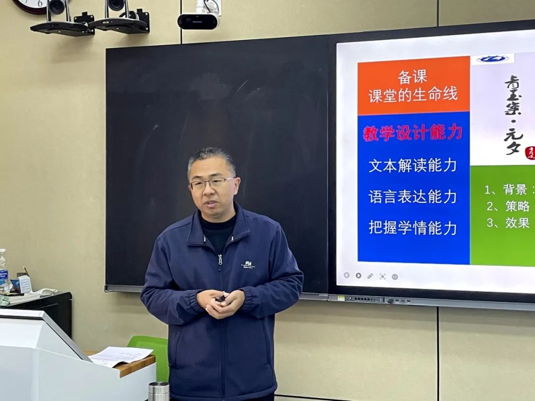 张老师从“如何上好一堂语文课”入手,与实际教学课堂相结合,主要讲解了教师应具有的教学设计能力、文本解读能力、语言表达能力、把握学情能力。在教学设计能力上,他以《青玉案》和《反对党八股》教案为例,指出在教学设计中思路结构最重要,清楚本节课在本单元的位置,设计问题串,掌握常见框架。并以《念奴娇·赤壁怀古》教学目标为例,讲解了教学目标叙写“四因素法”。
