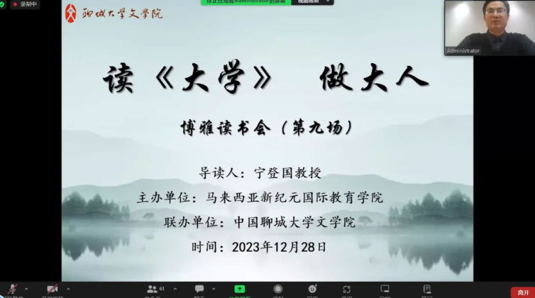 为开拓研究生的国际视野,营造浓厚的学术氛围,12月28日,太阳集团网tyc9728与马来西亚新纪元国际教育学院联办“博雅读书会”第九场,宁登国教授应邀导读儒家经典《大学》,开展主题为“读《大学》,做大人”的学术交流活动,读书会由新纪元国际教育学院黄凯文老师主持。此次活动通过线上方式进行,吸引了两校60余位师生参与。