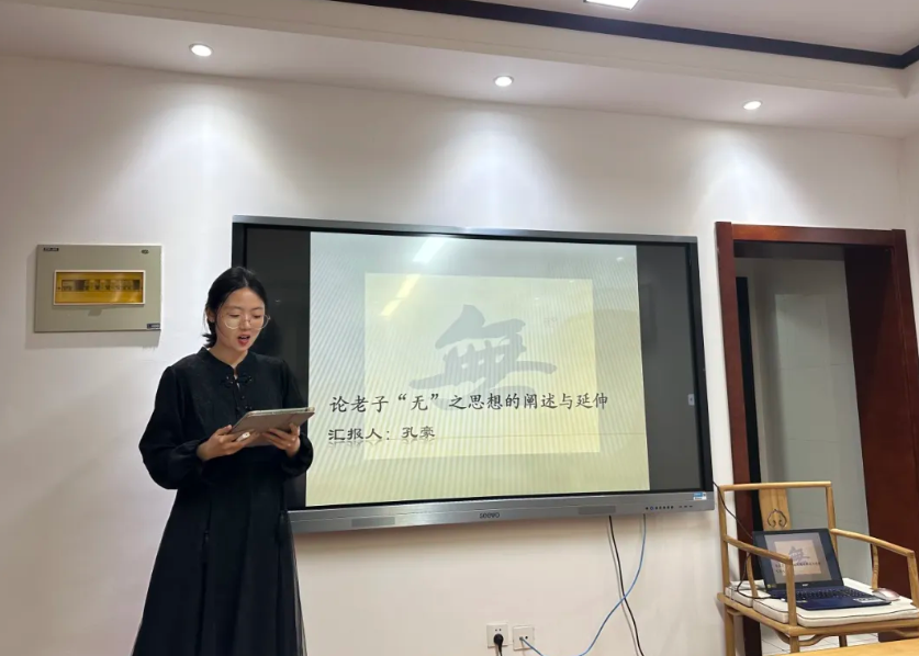 孔豪以“论老子‘无’之思想的阐述与延伸”为题进行汇报。她从三个方面论述了“无”思想对于中国文化的影响,分析了其所包含的哲学价值与现实意义。杨雪锦指出主讲人具备很强的领悟能力和问题意识,论证材料翔实,阐释层层递进。
