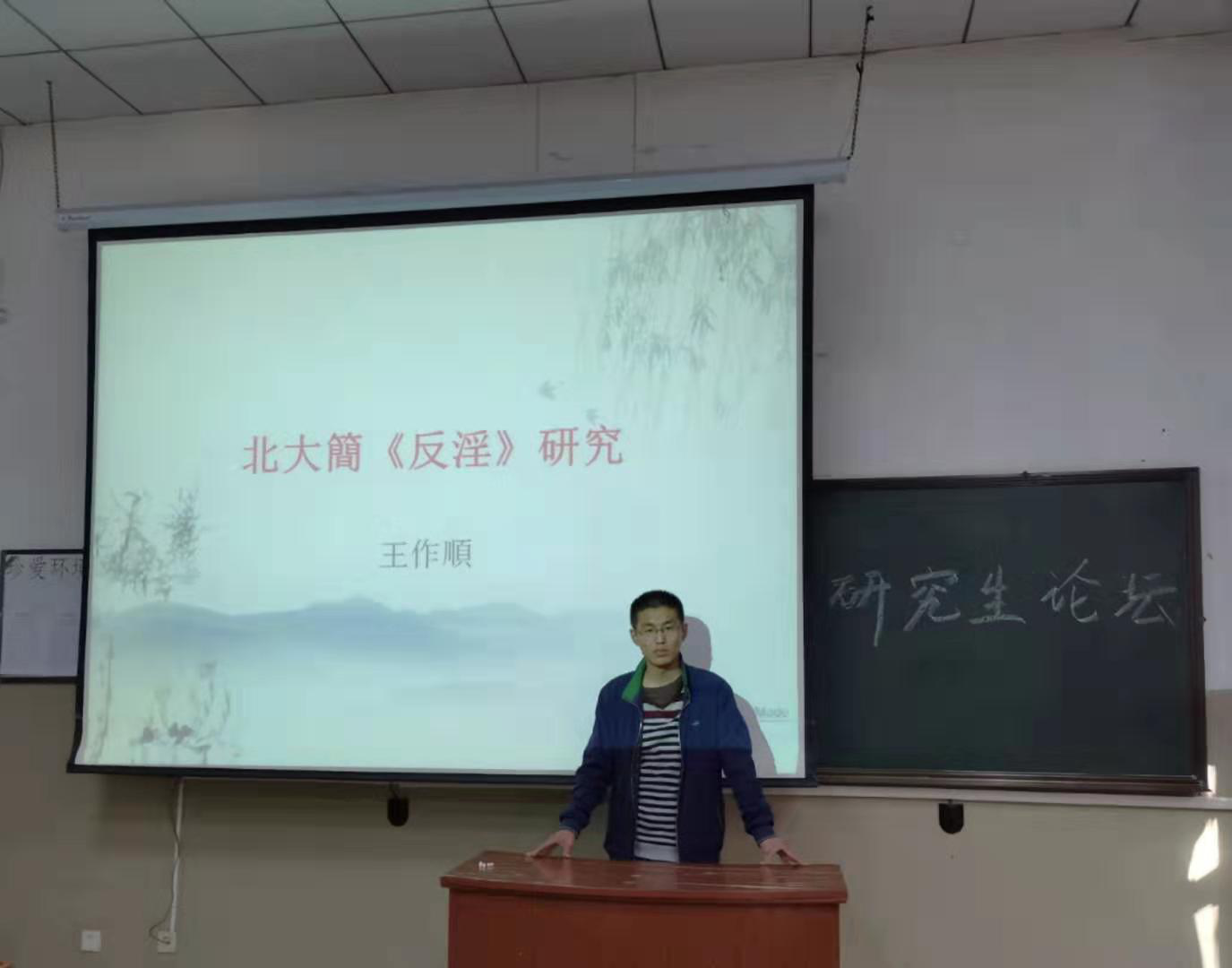 10月31日下午2:30分,研究生学术论坛在太阳集团网tyc9728教学楼A区316教室举行。此次论坛的主讲人是2017级中国古代文学专业研究生王作顺,题目为《北大简<反淫>及相关问题研究》。18级、19级全体研究生参加了本次论坛。