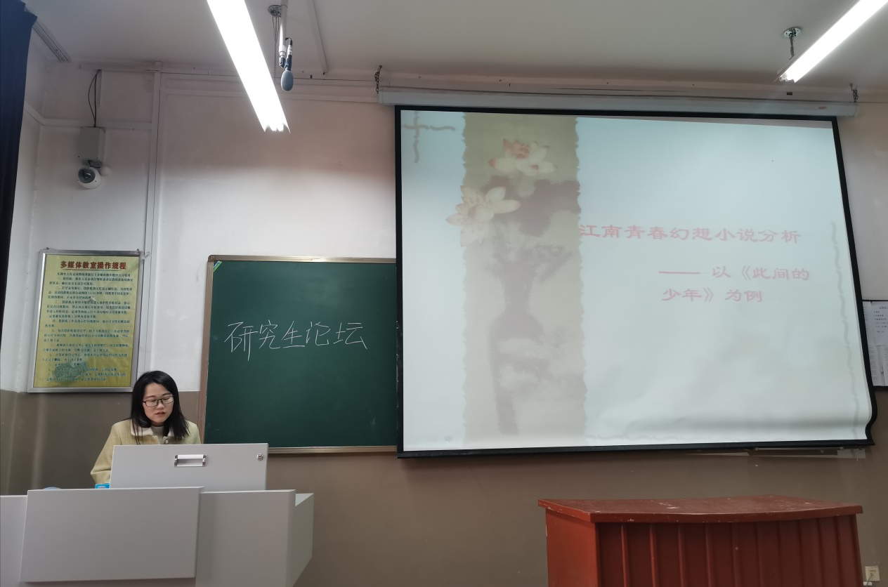 12月5日下午2:30分,由太阳集团网tyc9728研究生会主办的研究生学术论坛活动在3A203教室举行。此次论坛由17级中国现当代文学专业研究生盛媛华同学主讲,讲座题目是《江南青春幻想小说——以<此间的少年>为例》。本学期的研究生学术论坛到今天为止已经是第八期了,全体18级、19级研究生参加了本次论坛。