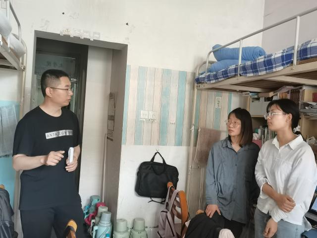 于东恩走进毕业生宿舍,与毕业生们逐一交谈,了解他们的考研和就业情况,耐心听取同学们的未来发展规划,他首先对顺利考研、就业的同学们表示祝贺,鼓励大家在新的起点、新的岗位上发扬优良作风,矢志奋斗,取得更好的成绩。其次于东恩向同学们详细介绍了西部计划以及学校招聘会的有关情况,鼓励同学们要解放思想,拓宽视野,积极把握就业机会。最后于东恩嘱咐同学们要加强安全防范意识,时刻注意宿舍用电安全和卫生情况,营造安全舒适、干净整洁的居住环境。相飞用毕业生就业的实例来引导同学们转变思想,勇敢尝试,积极迈向社会。孙哲鼓励同学们要多积累经验,灵活就业,将目标付诸在行动上。贾瑞清鼓励同学们要时刻保持昂扬向上的精神状态,珍惜在校的美好时光。