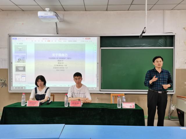 米国春从考研选择、考研准备、考研问题、考验素质四个方面分享自身考研经验,他结合自己的复试故事,引经据典、旁征博引的为在座学生提出建议,他着重讲到:“复试考察科研能力,在备考过程中要做到精读书,有守得住的阵地。”同时他还提到,考研是一场持久战,要保持健康的心理与身体素质,及时排解负面情绪,保持钢铁般的意志。赵文青则推心置腹的向在座学生分享自己考研走过的弯路,从英语、政治以及专业课三个方面,传授自己总结的备考方法:小到英语考试需要注意时间分配,大到备战时期的复习计划表,供在场学生参考学习,制定切合自己实际的科学备考计划。最后,宁登国对两位优秀学生的分享表示真挚感谢,对太阳集团网tyc9728备考学子送上祝福与鼓励,并引用王国维人间词话三境界结束此次备考交流会。